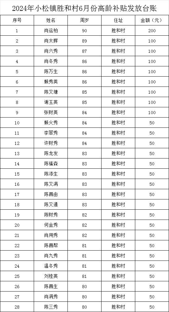 【老年人申領(lǐng)補貼和發(fā)放信息】石城縣小松鎮(zhèn)勝和村2024年6月高齡補貼發(fā)放公示表