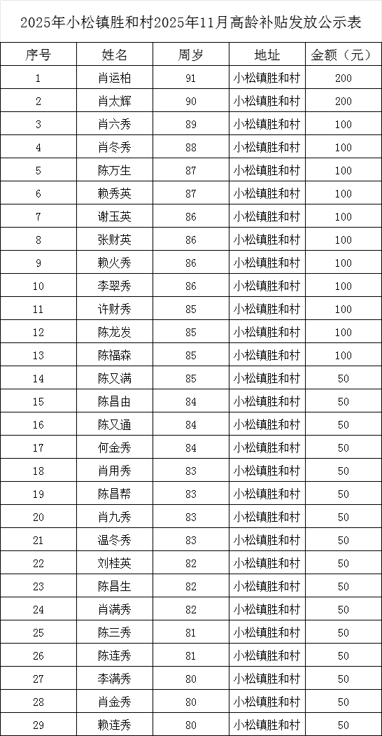 【老年人申領(lǐng)補貼和發(fā)放信息】石城縣小松鎮(zhèn)勝和村2025年11月高齡補貼發(fā)放公示表