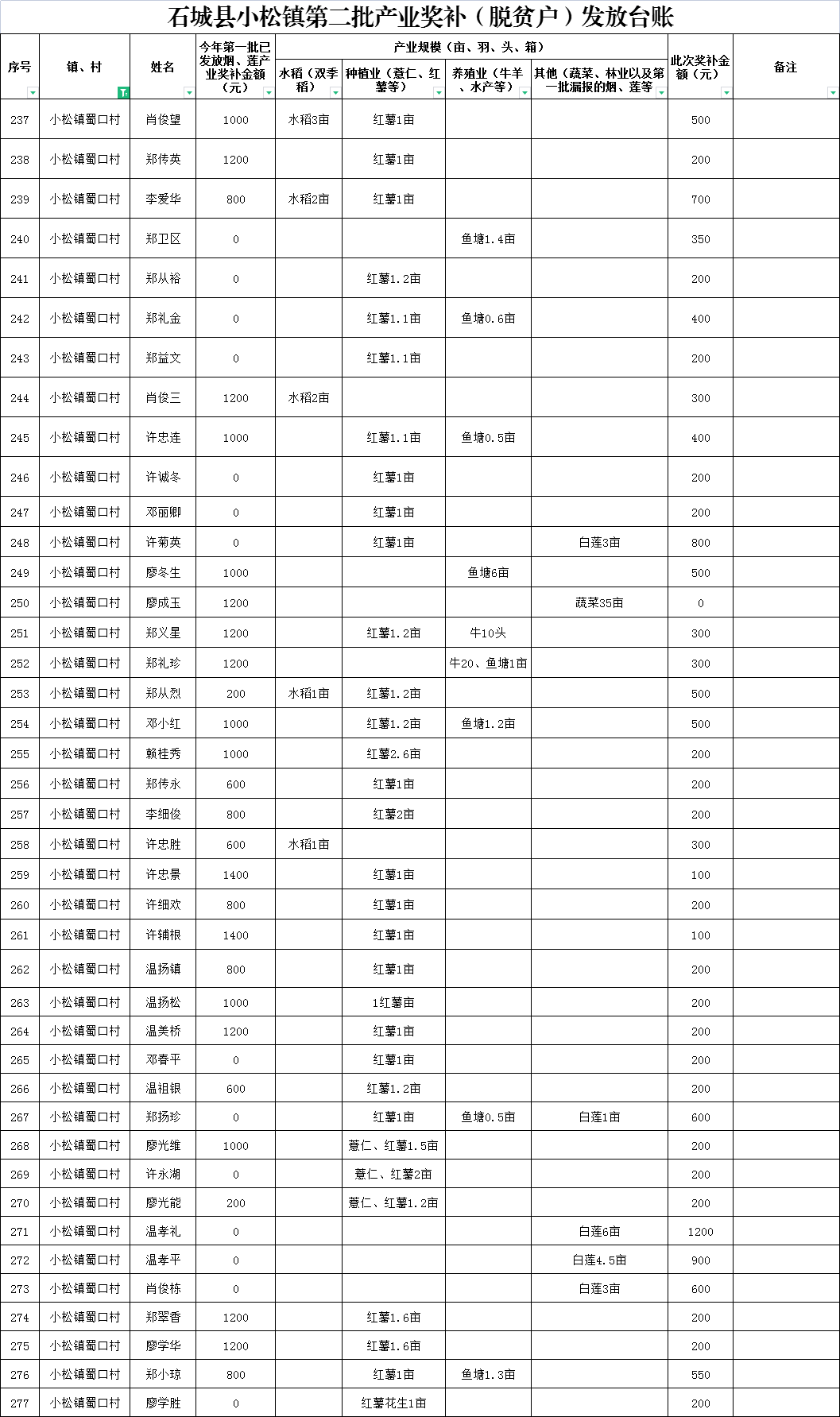 【產(chǎn)業(yè)扶持】石城縣小松鎮(zhèn)蜀口村第二批產(chǎn)業(yè)獎(jiǎng)補(bǔ)(脫貧戶)發(fā)放臺(tái)賬