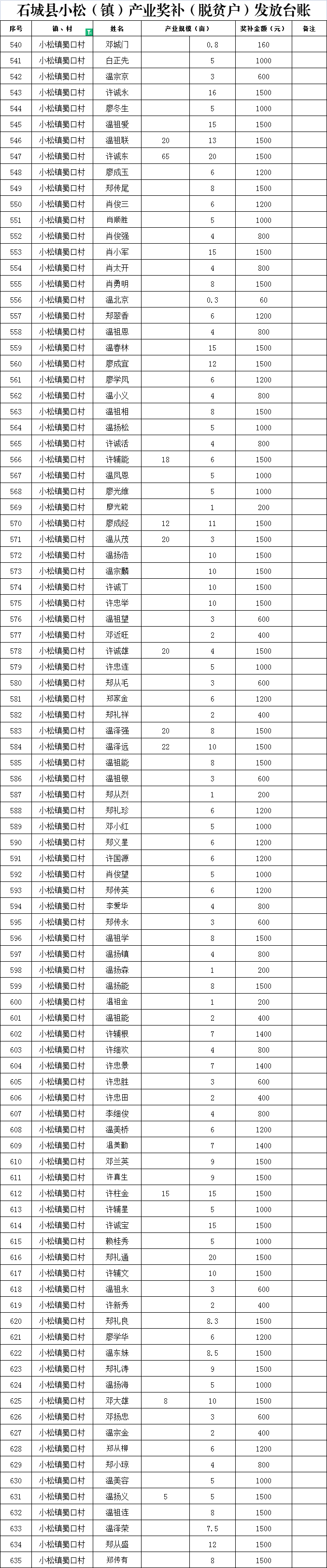 【產(chǎn)業(yè)扶持】石城縣小松(鎮(zhèn))蜀口村產(chǎn)業(yè)獎補(脫貧戶)發(fā)放臺賬