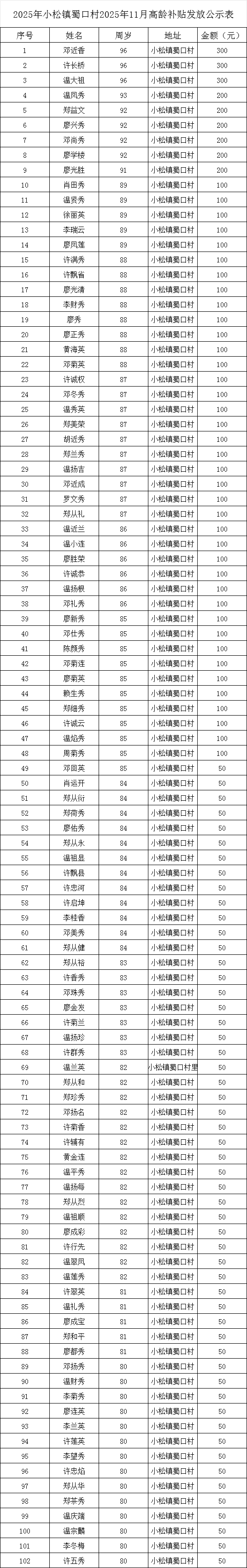 【老年人申領(lǐng)補貼和發(fā)放信息】石城縣小松鎮(zhèn)蜀口村2025年11月高齡補貼發(fā)放公示表