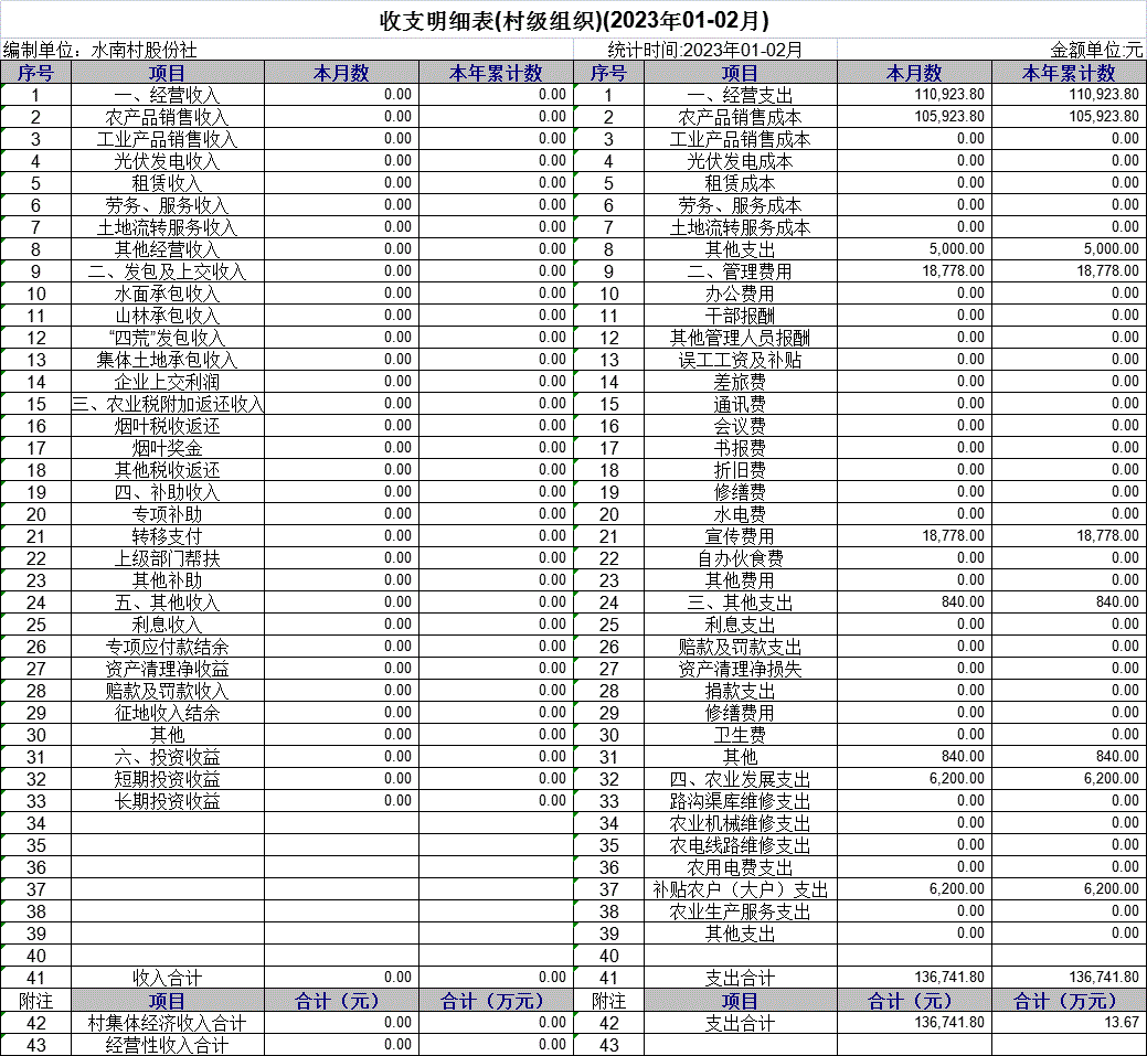 大由鄉(xiāng)水南村2023年1-2月收支明細(xì)