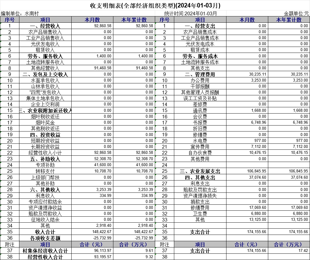 大由鄉(xiāng)水南村2024年1-3月收支明細(xì)