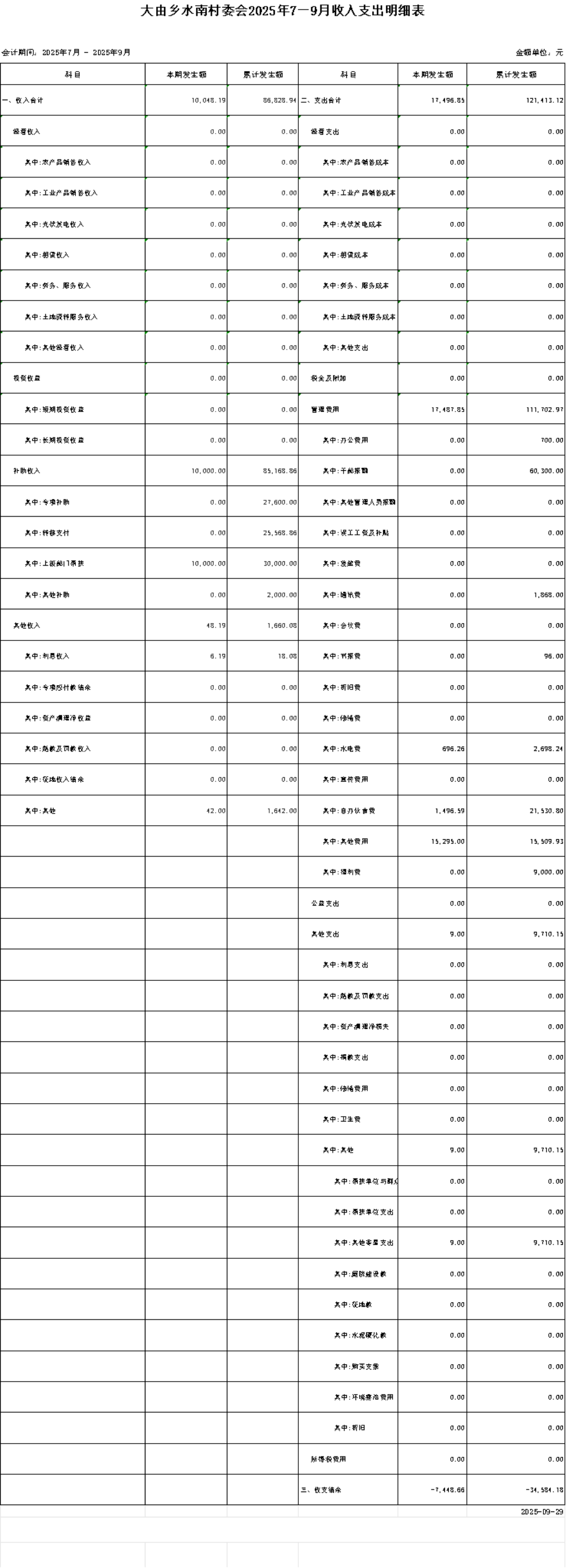 大由鄉(xiāng)水南村委會2025年7—9月收入支出明細表