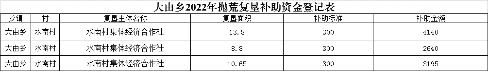 大由鄉(xiāng)水南村2022年拋荒復(fù)墾補(bǔ)助資金登記表