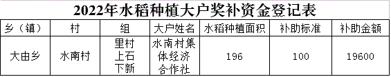 大由鄉(xiāng)水南村2022年水稻種植大戶獎(jiǎng)補(bǔ)資金登記表
