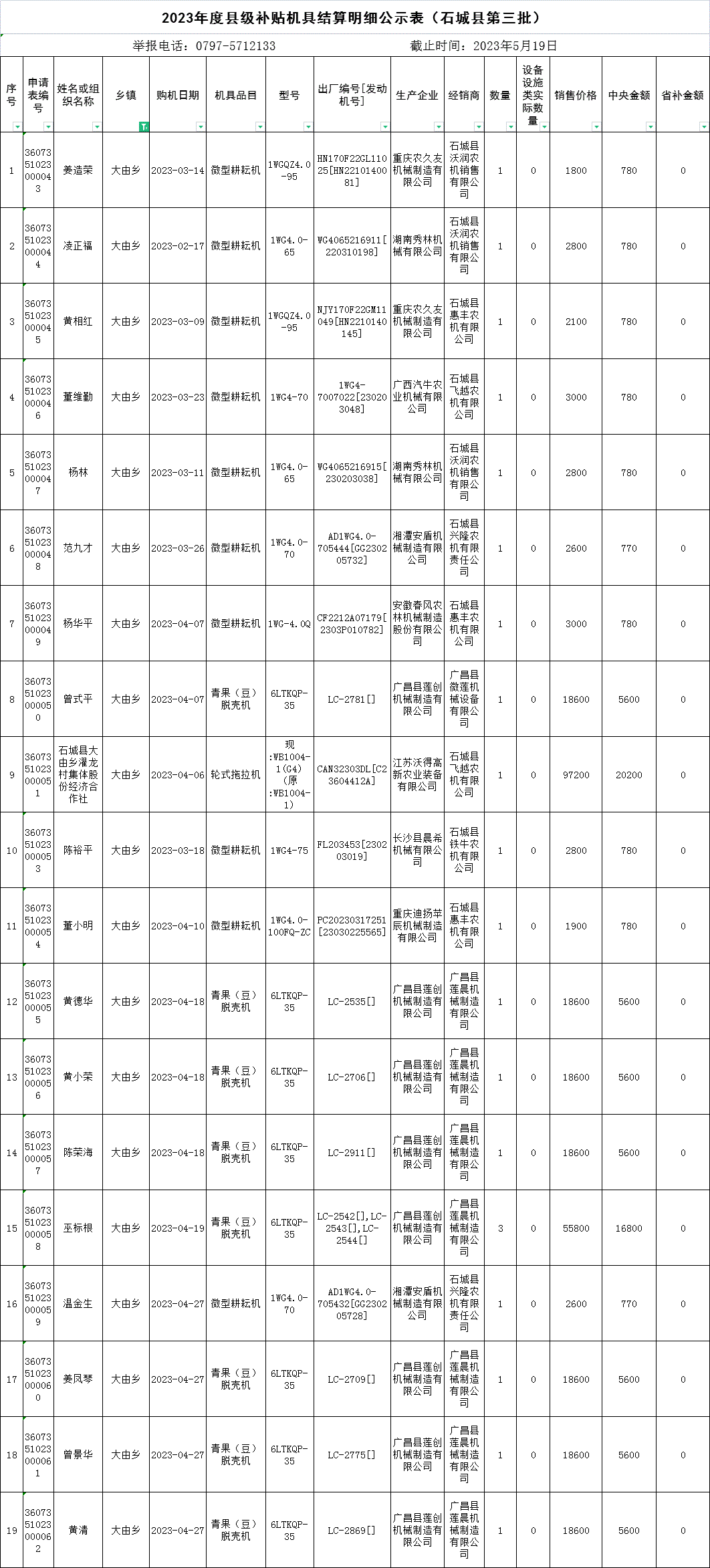 2023年度縣級(jí)補(bǔ)貼機(jī)具結(jié)算明細(xì)公示表(石城縣第三批)