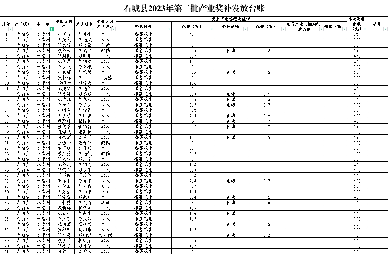 石城縣大由鄉(xiāng)水南村2023年第二批產(chǎn)業(yè)獎(jiǎng)補(bǔ)發(fā)放臺(tái)賬
