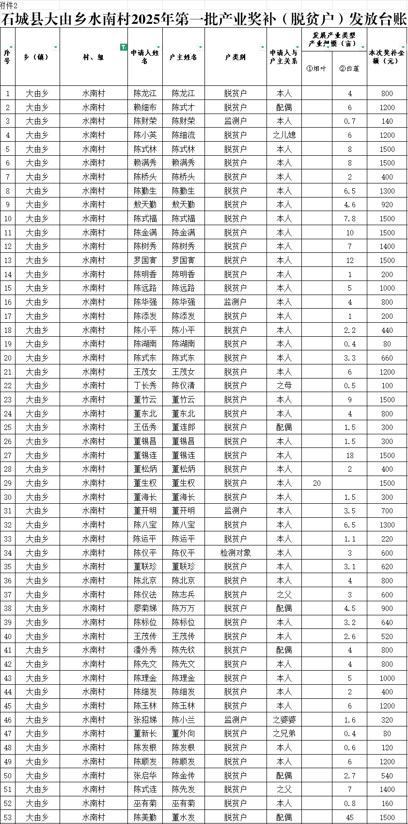 石城縣大由鄉(xiāng)水南村2025年第一批產(chǎn)業(yè)獎補(脫貧戶)發(fā)放臺賬