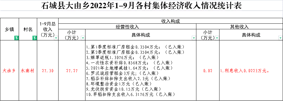 石城縣大由鄉(xiāng)2022年1-9月水南村集體經(jīng)濟收入情況統(tǒng)計表