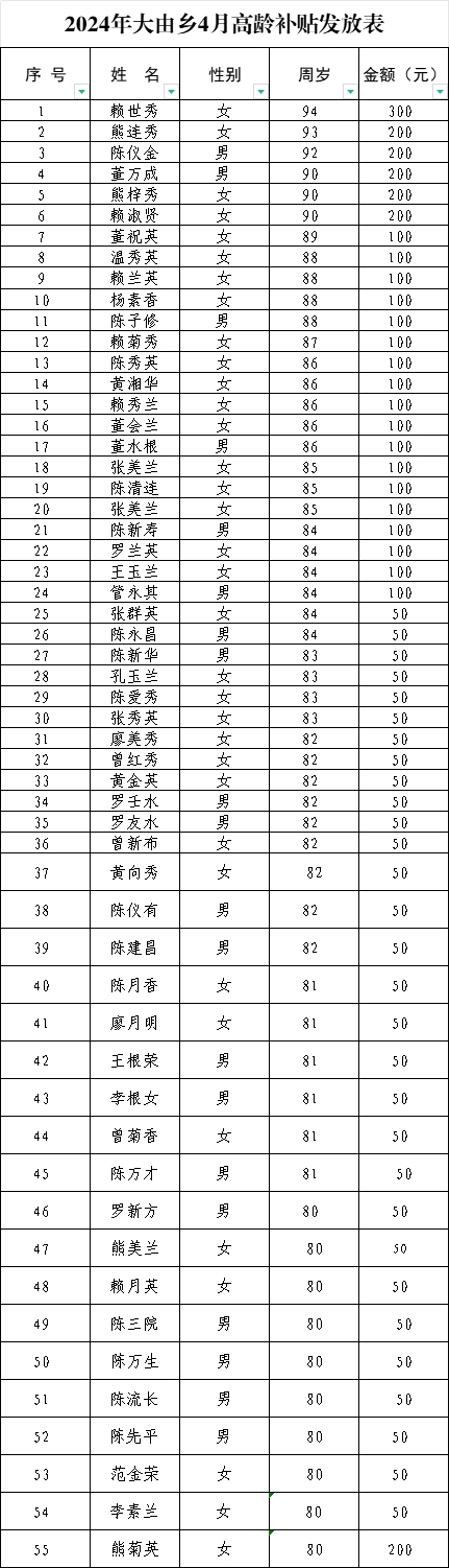 【老年人申領(lǐng)補(bǔ)貼和發(fā)放信息】2024年大由鄉(xiāng)水南村4月高齡補(bǔ)貼發(fā)放表