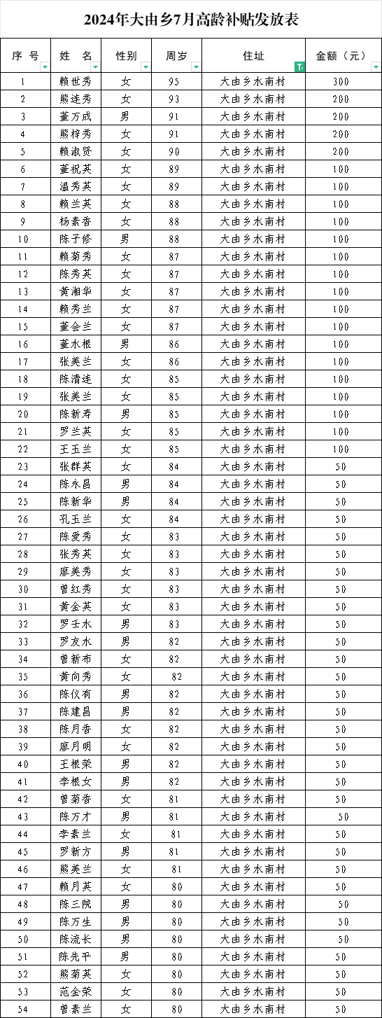 【老年人申領補貼和發(fā)放信息】2024年大由鄉(xiāng)水南村7月高齡補貼發(fā)放表