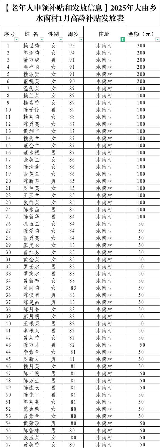 【老年人申領(lǐng)補(bǔ)貼和發(fā)放信息】2025年大由鄉(xiāng)水南村1月高齡補(bǔ)貼發(fā)放表