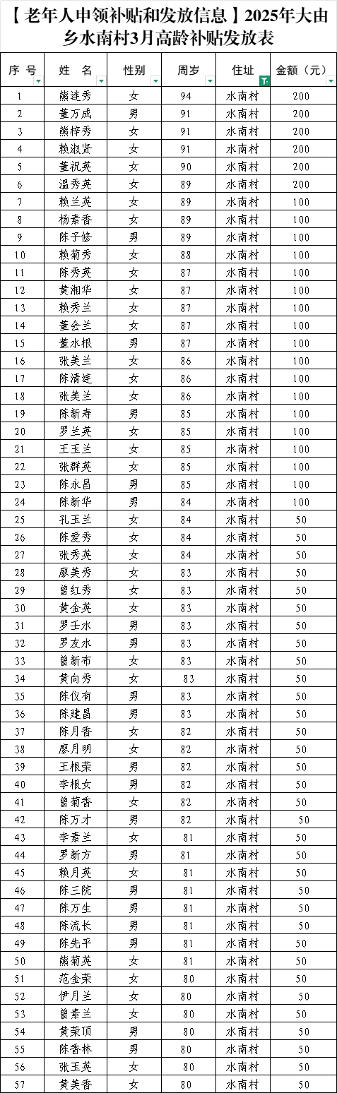 【老年人申領(lǐng)補(bǔ)貼和發(fā)放信息】2025年大由鄉(xiāng)水南村3月高齡補(bǔ)貼發(fā)放表