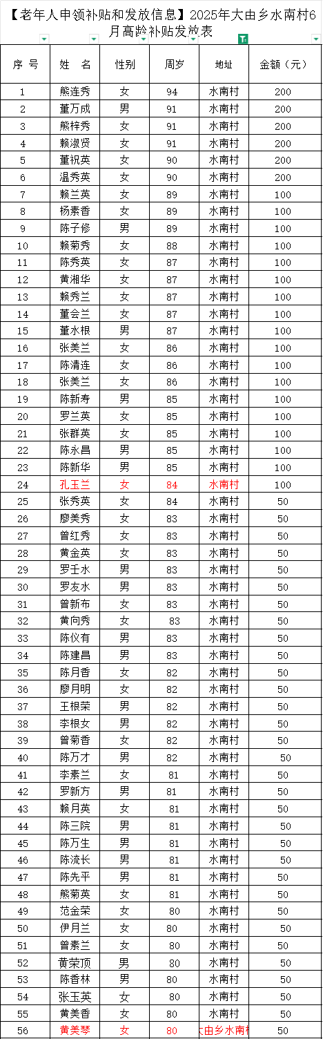 【老年人申領(lǐng)補(bǔ)貼和發(fā)放信息】2025年大由鄉(xiāng)水南村6月高齡補(bǔ)貼發(fā)放表