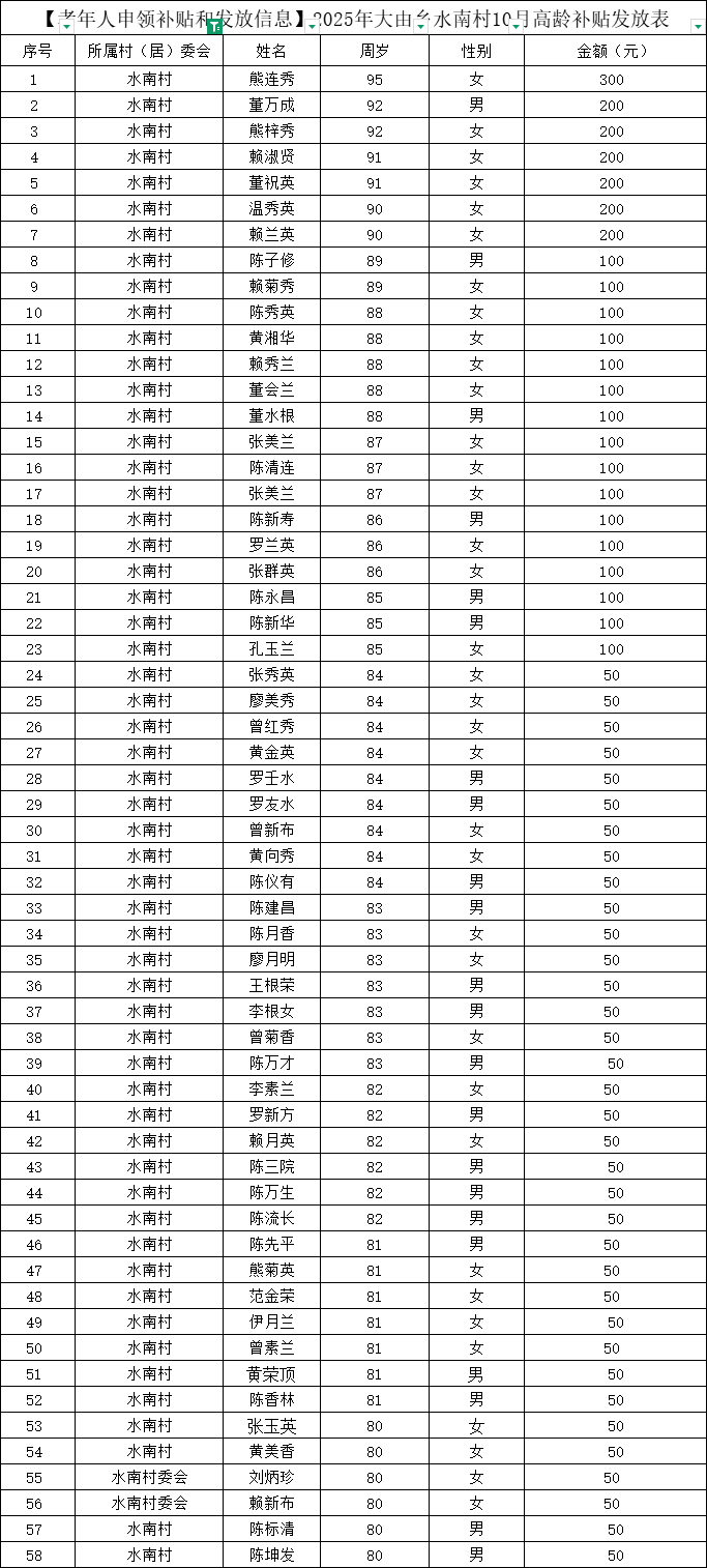 【老年人申領(lǐng)補(bǔ)貼和發(fā)放信息】2025年大由鄉(xiāng)水南村10月高齡補(bǔ)貼發(fā)放表