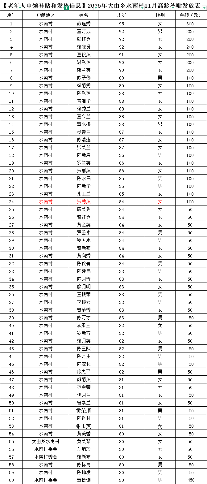 【老年人申領(lǐng)補(bǔ)貼和發(fā)放信息】2025年大由鄉(xiāng)水南村11月高齡補(bǔ)貼發(fā)放表