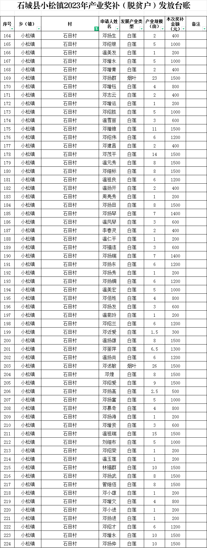 石城縣小松鎮(zhèn)石田村2023年第一批產(chǎn)業(yè)獎補發(fā)放臺賬