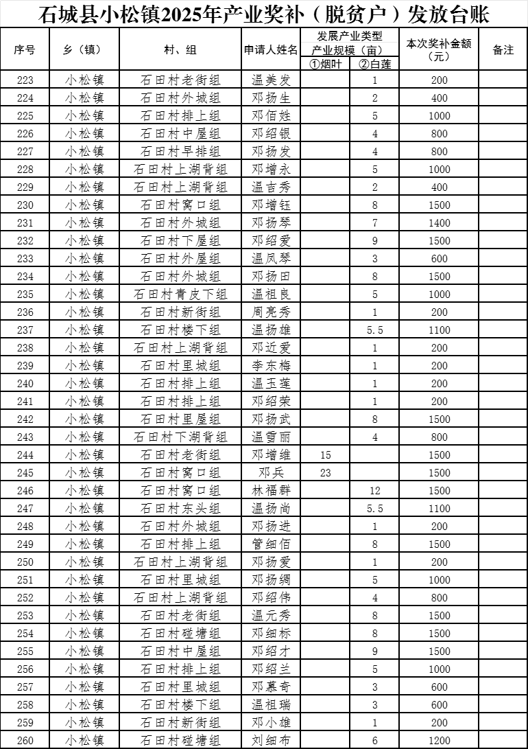 石城縣小松鎮(zhèn)石田村2025年第一批產(chǎn)業(yè)獎(jiǎng)補(bǔ)發(fā)放臺(tái)賬