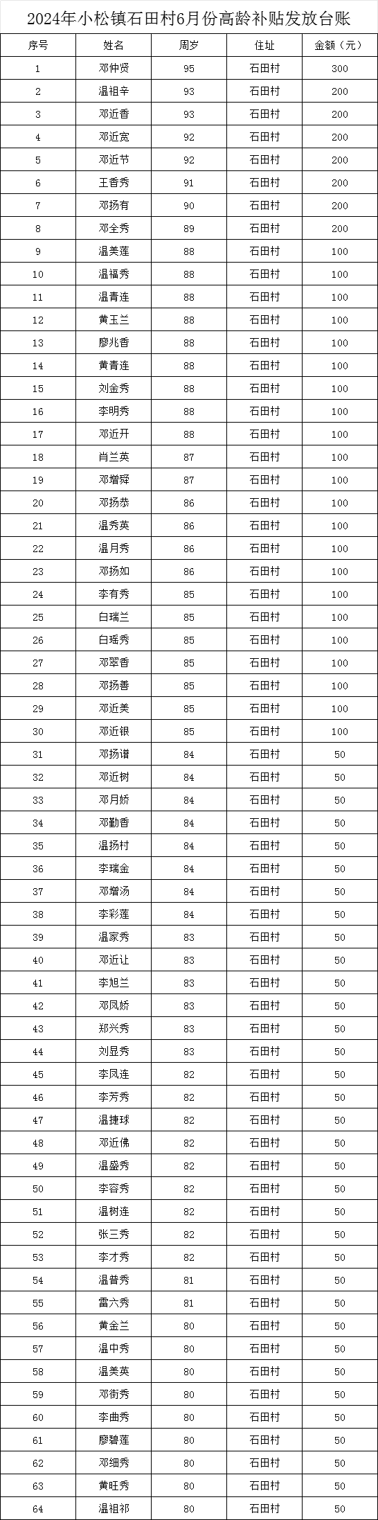 【老年人申領(lǐng)補貼和發(fā)放信息】石城縣小松鎮(zhèn)石田村2024年6月高齡補貼發(fā)放公示表