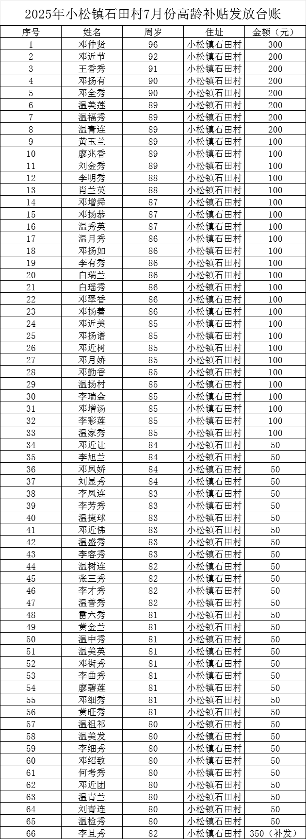 【老年人申領(lǐng)補(bǔ)貼和發(fā)放信息】石城縣小松鎮(zhèn)石田村2025年7月高齡補(bǔ)貼發(fā)放公示表
