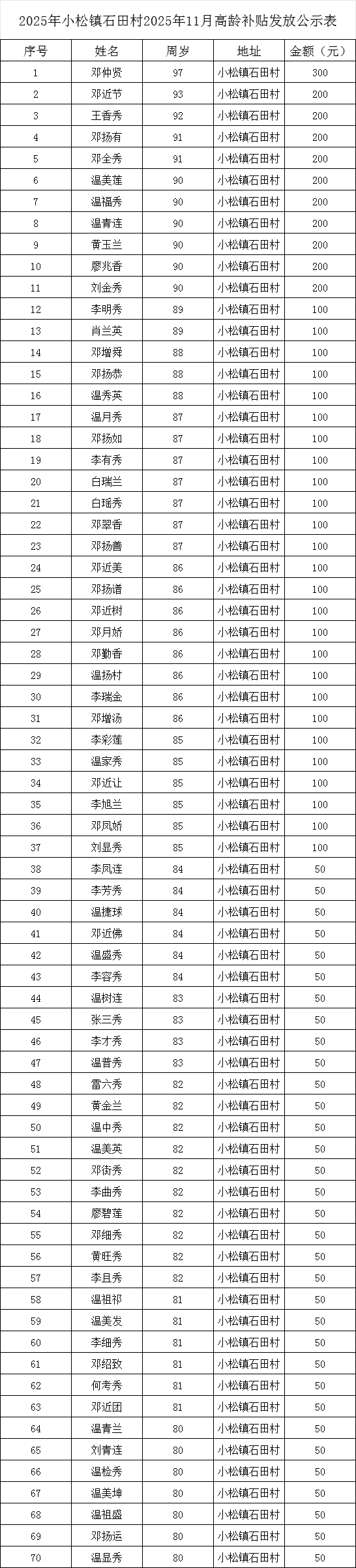 【老年人申領(lǐng)補貼和發(fā)放信息】石城縣小松鎮(zhèn)石田村2025年11月高齡補貼發(fā)放公示表
