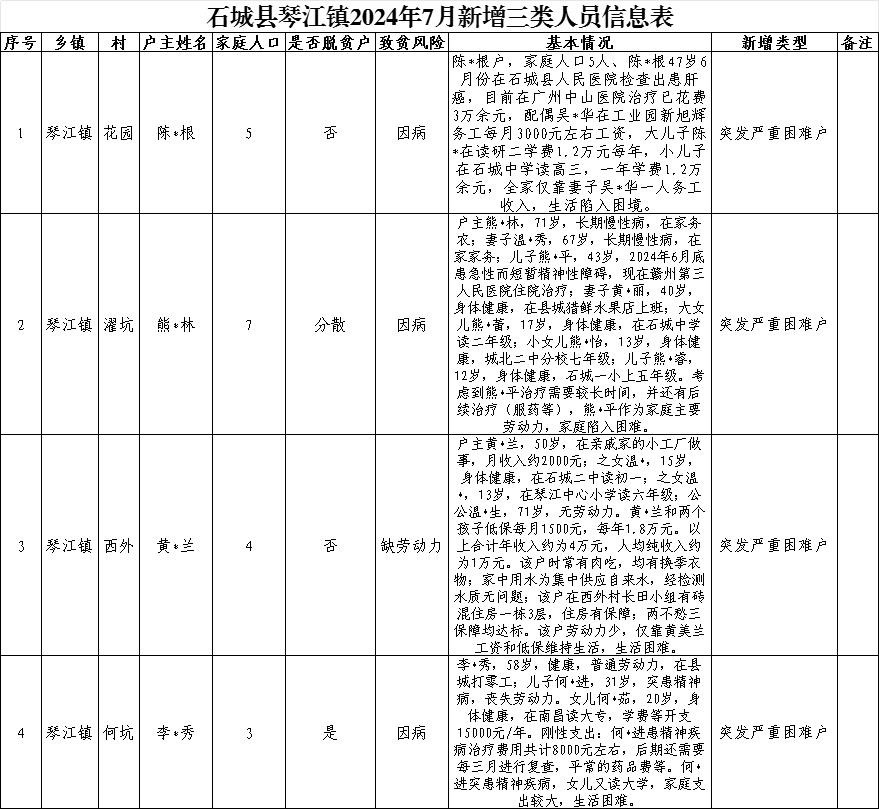 根據(jù)石城縣防貧返貧監(jiān)測(cè)預(yù)警與幫扶工作要求,縣鄉(xiāng)村振興局對(duì)我鎮(zhèn)擬納入監(jiān)測(cè)范圍的“三類人員”進(jìn)行批復(fù),同意將陳*根等4戶19人納入監(jiān)測(cè)對(duì)象,現(xiàn)予以公告(名單附后)。