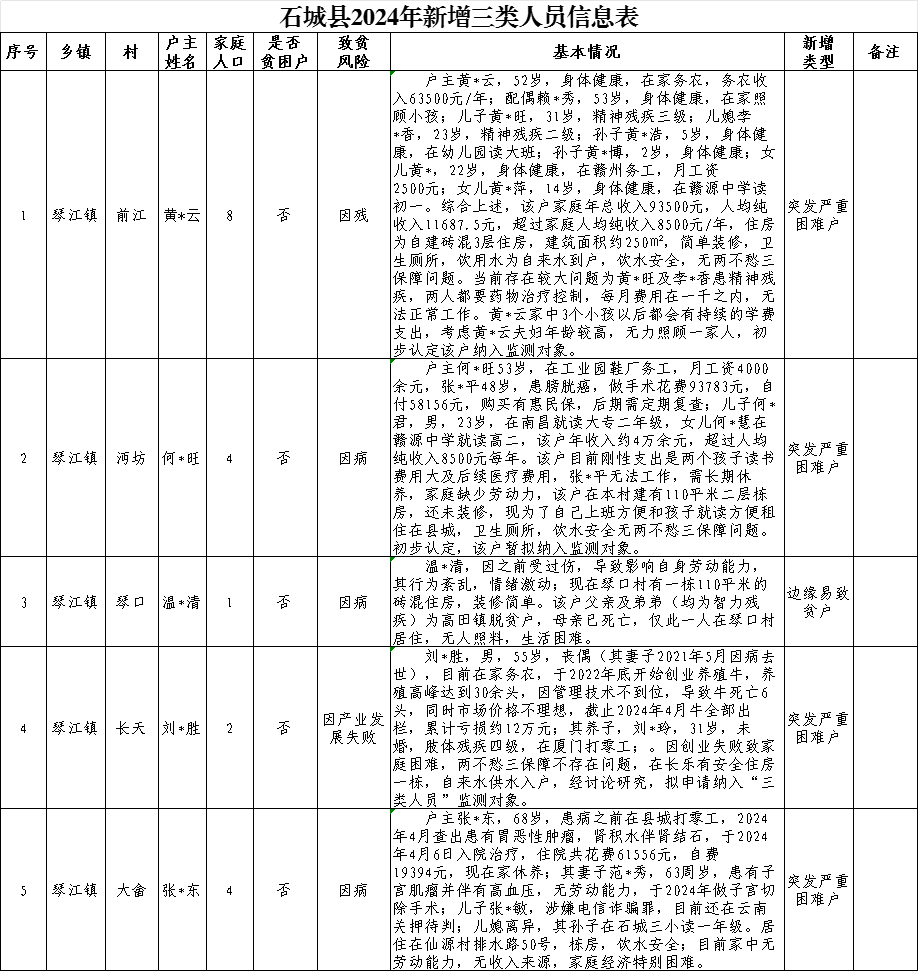 根據(jù)石城縣防貧返貧監(jiān)測預(yù)警與幫扶工作要求,縣鄉(xiāng)村振興局對我鎮(zhèn)擬新增納入“三類人員”監(jiān)測的對象進(jìn)行批復(fù),同意將黃*云等5戶19人新增為“三類人員”,現(xiàn)予以公告(名單附后)。