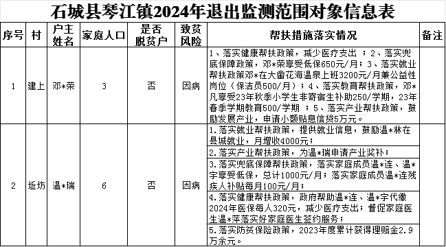 根據(jù)石城縣防貧返貧監(jiān)測預(yù)警與幫扶工作要求,縣鄉(xiāng)村振興局對我鎮(zhèn)擬退出監(jiān)測范圍的“三類人員”進(jìn)行批復(fù),同意將鄧*榮等2戶9人退出監(jiān)測范圍,現(xiàn)予以公告(名單附后)。