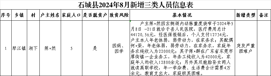 根據(jù)石城縣防貧返貧監(jiān)測預(yù)警與幫扶工作要求,縣鄉(xiāng)村振興局對我鎮(zhèn)擬納入監(jiān)測范圍的“三類人員”進(jìn)行批復(fù),同意將陳*然1戶5人納入監(jiān)測對象,現(xiàn)予以公告(名單附后)。