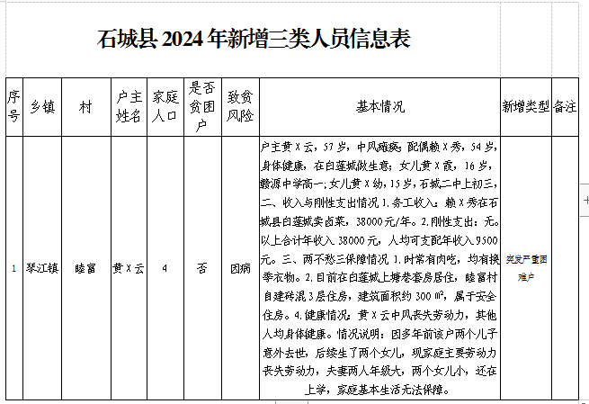 根據(jù)石城縣防貧返貧監(jiān)測(cè)預(yù)警與幫扶工作要求,縣鄉(xiāng)村振興局對(duì)我鎮(zhèn)擬新增納入“三類人員”監(jiān)測(cè)的對(duì)象進(jìn)行批復(fù),同意將黃x云1戶4人新增為“三類人員”,現(xiàn)予以公告(名單附后)。