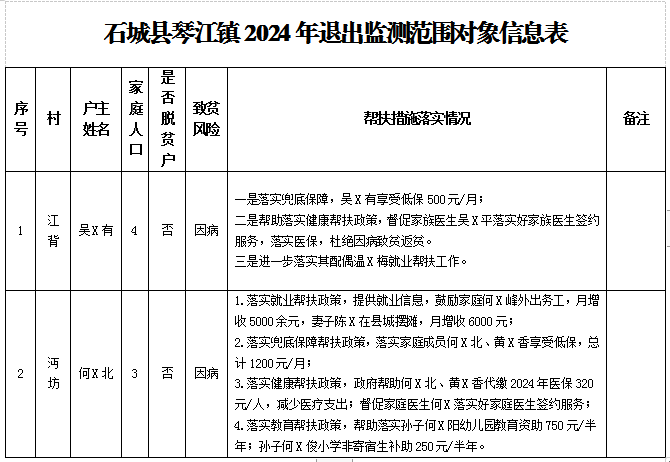 根據(jù)石城縣防貧返貧監(jiān)測預(yù)警與幫扶工作要求,縣鄉(xiāng)村振興局對我鎮(zhèn)擬退出監(jiān)測范圍的“三類人員”進(jìn)行批復(fù),同意將吳X有等2戶10人退出監(jiān)測范圍,現(xiàn)予以公告(名單附后)。