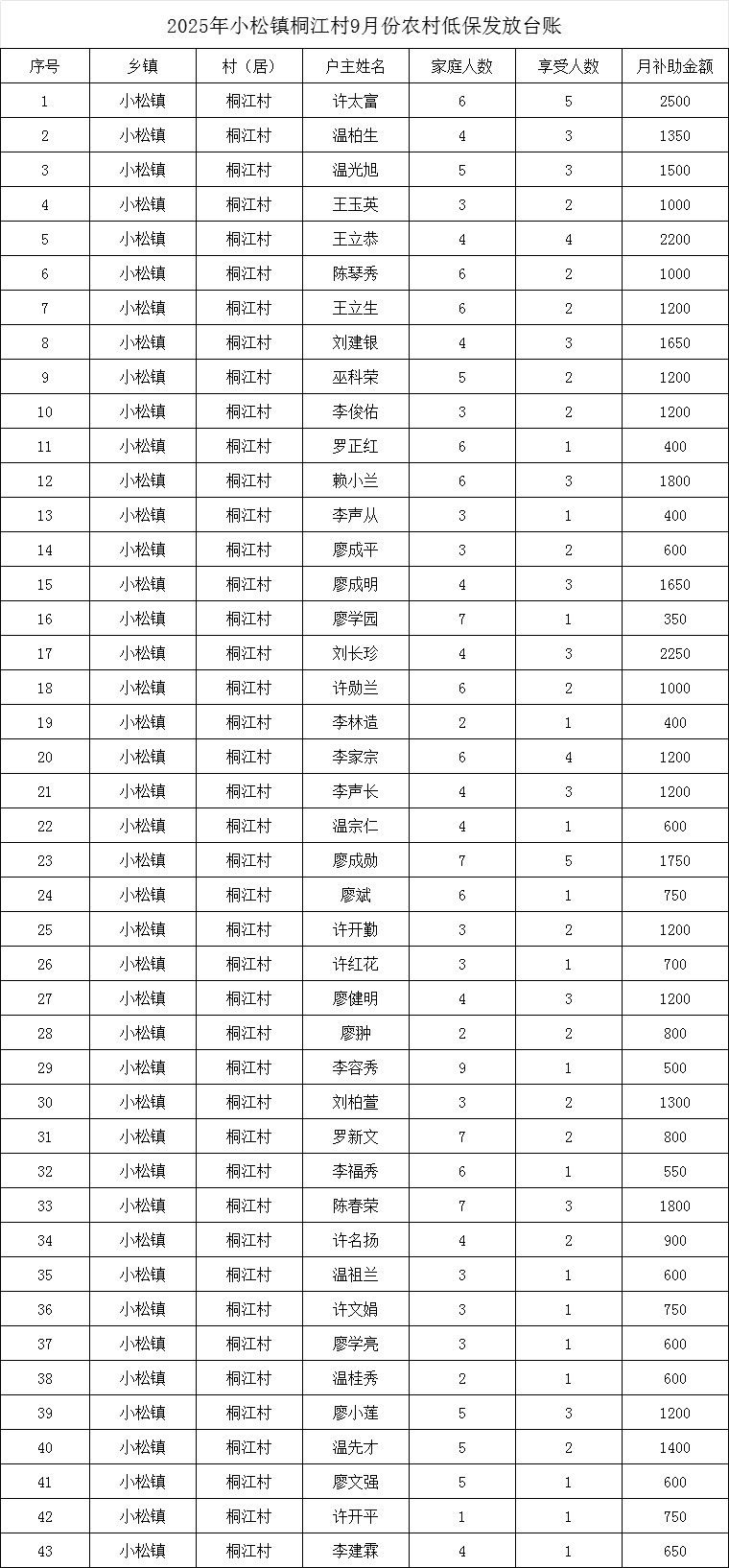 【最低生活保障】小松鎮(zhèn)桐江村2025年9月農村低保發(fā)放公示