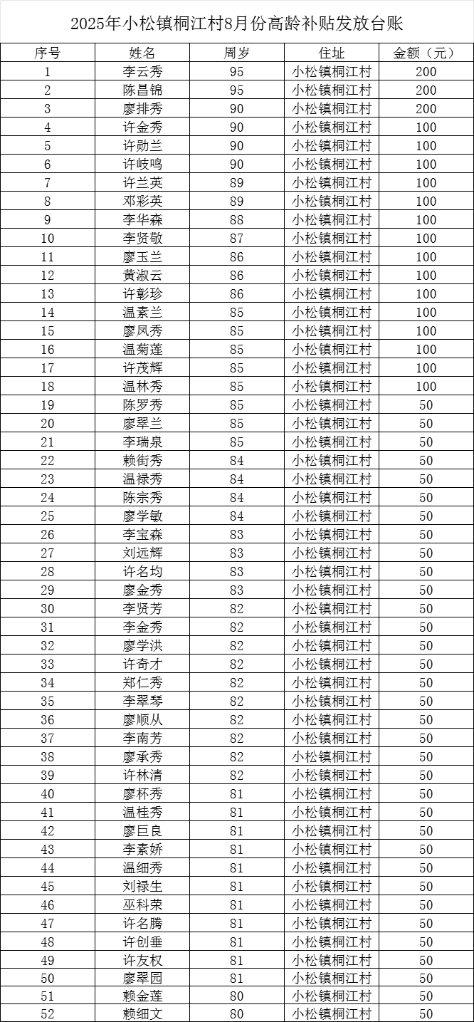 【老年人申領(lǐng)補(bǔ)貼和發(fā)放信息】石城縣小松鎮(zhèn)桐江村2025年8月高齡補(bǔ)貼發(fā)放公示表