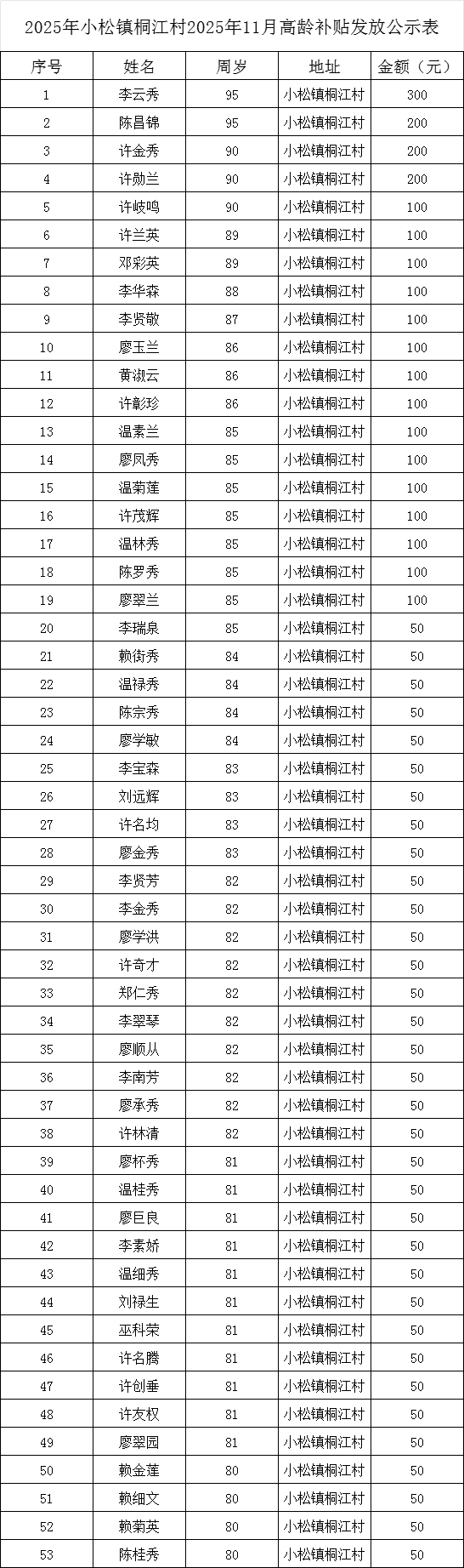 【老年人申領(lǐng)補(bǔ)貼和發(fā)放信息】石城縣小松鎮(zhèn)桐江村2025年11月高齡補(bǔ)貼發(fā)放公示表
