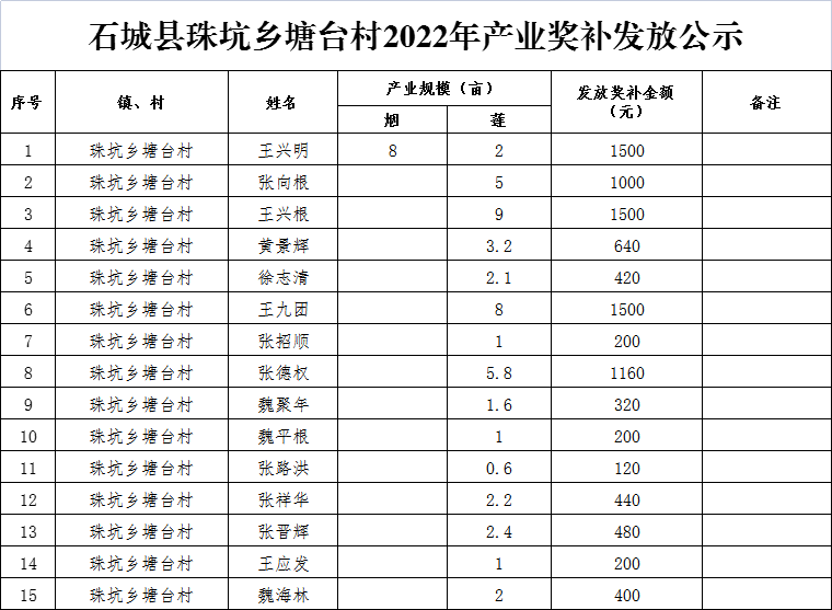 【涉農補貼】石城縣珠坑鄉(xiāng)塘臺村2022年產(chǎn)業(yè)獎補發(fā)放公示