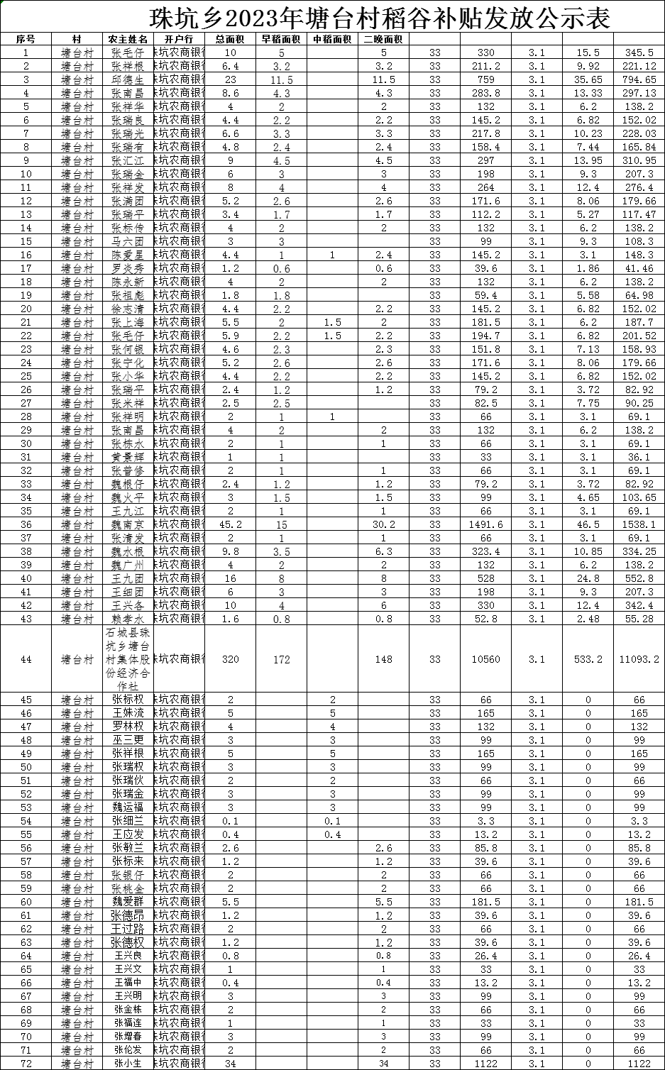 【涉農(nóng)補(bǔ)貼】珠坑鄉(xiāng)2023年塘臺(tái)村稻谷補(bǔ)貼發(fā)放公示表