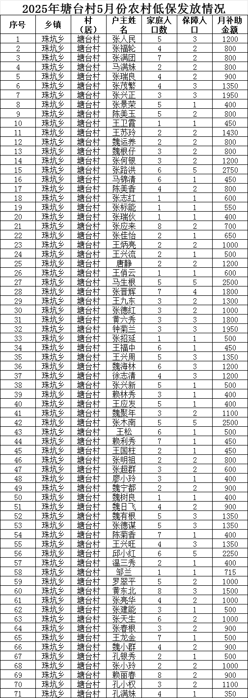 2025年塘臺村5月份農(nóng)村低保發(fā)放情況
