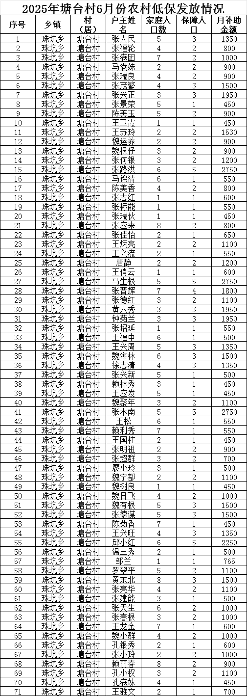 2025年塘臺(tái)村6月份農(nóng)村低保發(fā)放情況