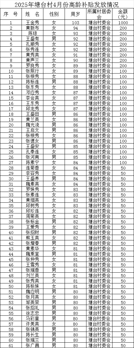 2025年塘臺(tái)村4月份高齡補(bǔ)貼發(fā)放情況