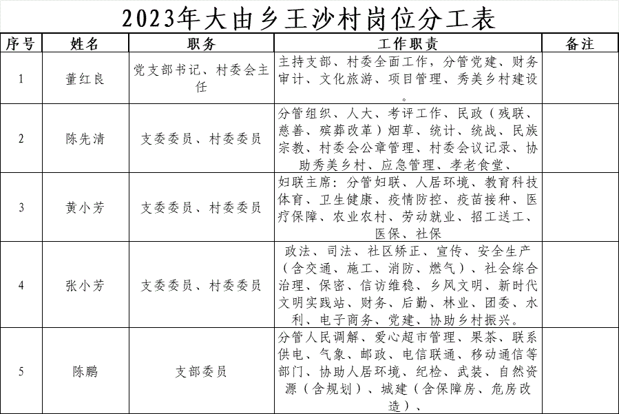 2023年大由鄉(xiāng)王沙村崗位分工表