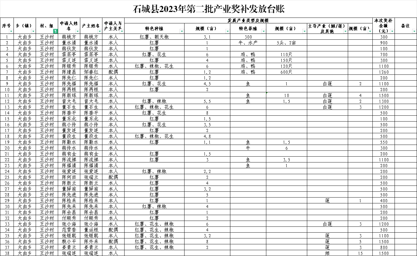 石城縣大由鄉(xiāng)王沙村2023年第二批產(chǎn)業(yè)獎(jiǎng)補(bǔ)發(fā)放臺(tái)賬
