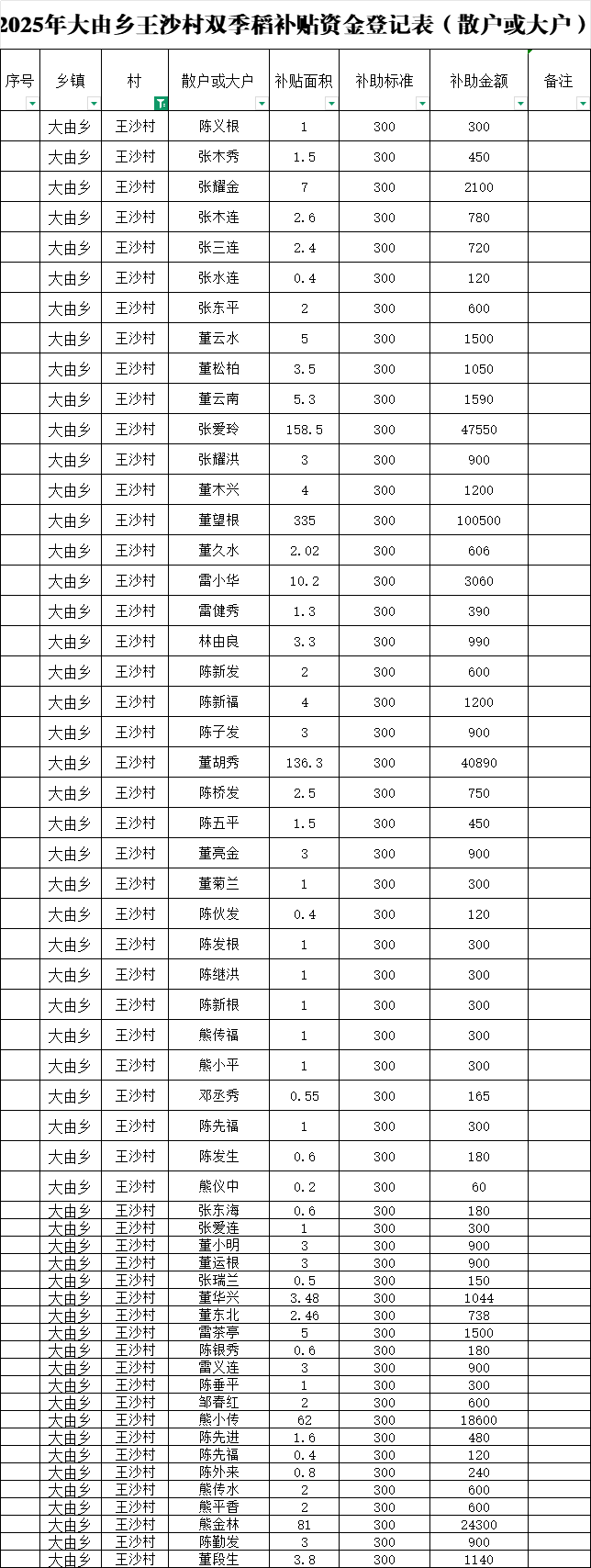 2025年大由鄉(xiāng)王沙村雙季稻補(bǔ)貼資金登記表(散戶或大戶)