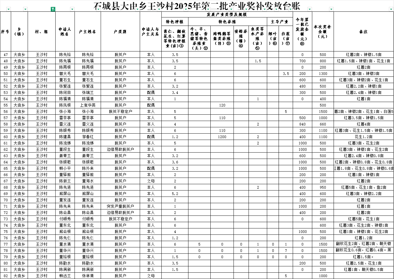 石城縣大由鄉(xiāng)王沙村2025年第二批產業(yè)獎補發(fā)放臺賬