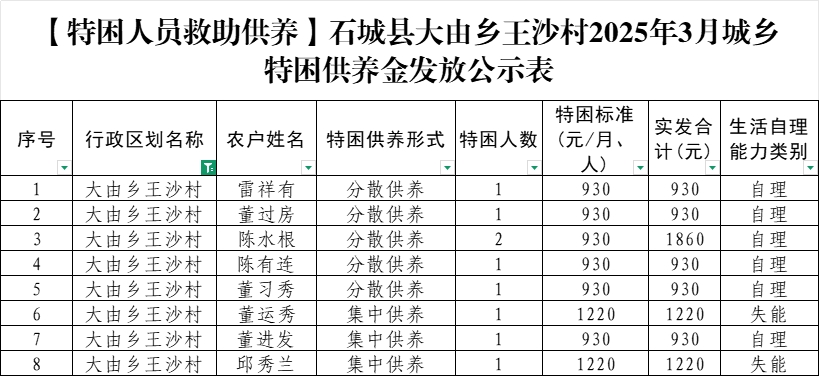 【特困人員救助供養(yǎng)】石城縣大由鄉(xiāng)王沙村2025年3月城鄉(xiāng)特困供養(yǎng)金發(fā)放公示表