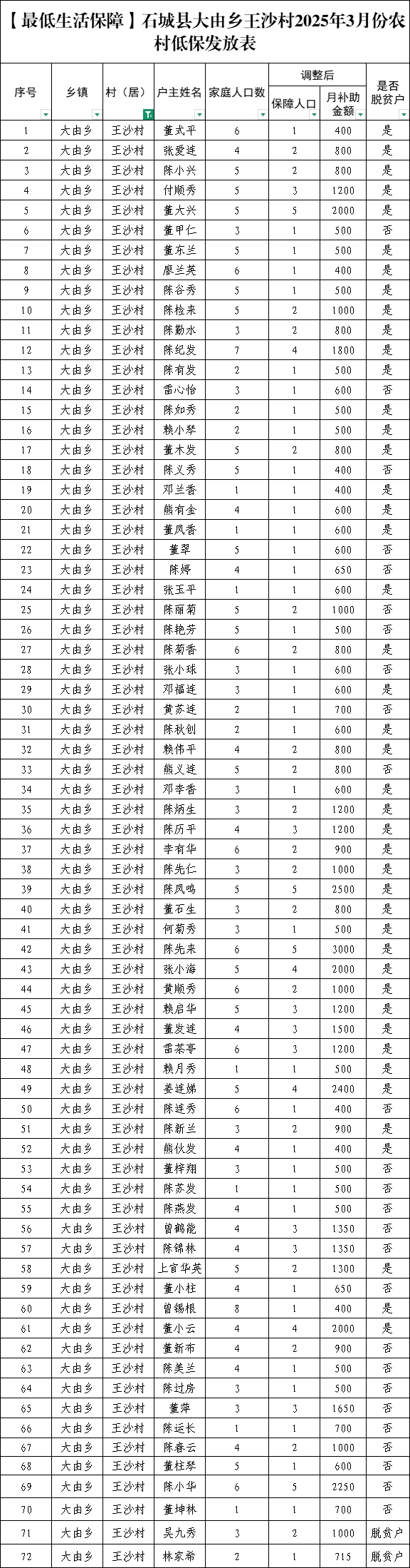 【最低生活保障】石城縣大由鄉(xiāng)王沙村2025年3月份農(nóng)村低保發(fā)放表