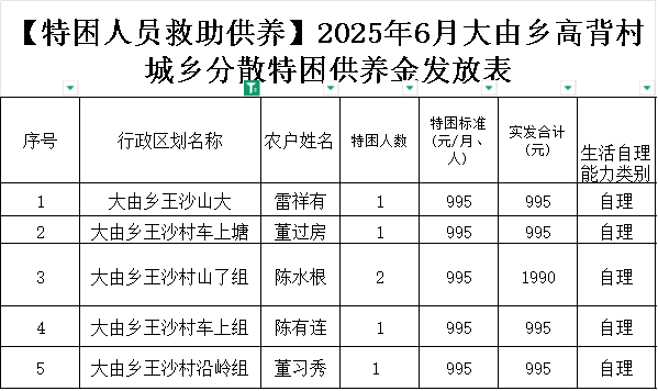 【特困人員救助供養(yǎng)】2025年6月大由鄉(xiāng)王沙村城鄉(xiāng)分散特困供養(yǎng)金發(fā)放表