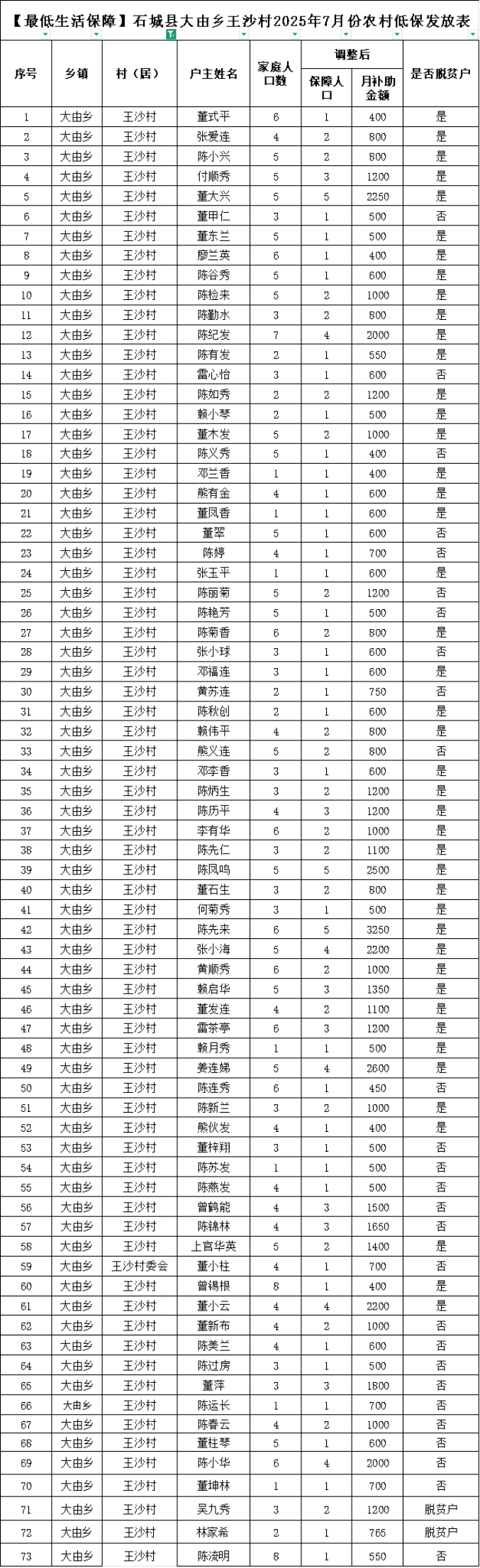 【最低生活保障】石城縣大由鄉(xiāng)王沙村2025年7月份農(nóng)村低保發(fā)放表