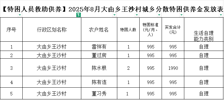 【特困人員救助供養(yǎng)】2025年8月大由鄉(xiāng)王沙村城鄉(xiāng)分散特困供養(yǎng)金發(fā)放表