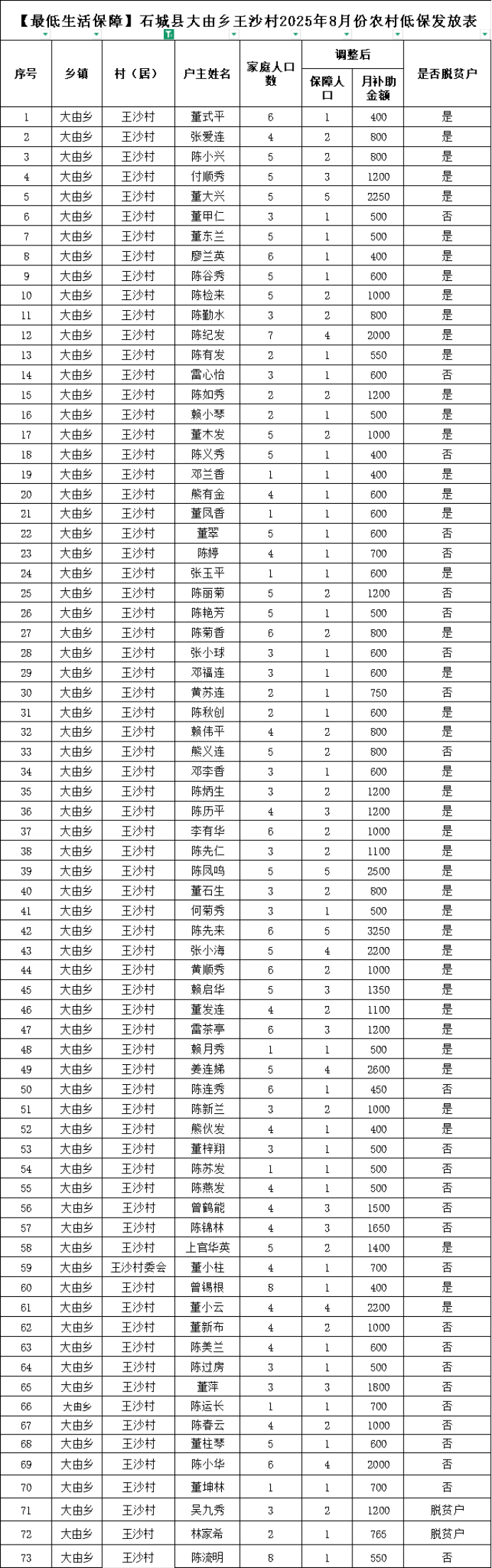 【最低生活保障】石城縣大由鄉(xiāng)王沙村2025年8月份農(nóng)村低保發(fā)放表